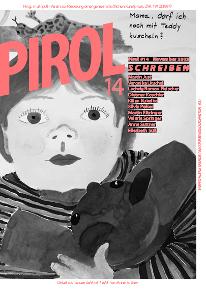 Im Jänner 2015 brachten wir die erste Ausgabe Pirol mit einer bescheidenen Auflage von 100 Stück in schwarz/weiß heraus. Der Inhalt stellte sich aus unterschiedlichen Medien der bildenden Kunst (Fotografie, Malerei, Zeichnung) und der Literatur zusammen. Die Verbindung der unterschiedlichen Beiträge sollte (und soll) den kunstinternen Diskurs bereichern.
